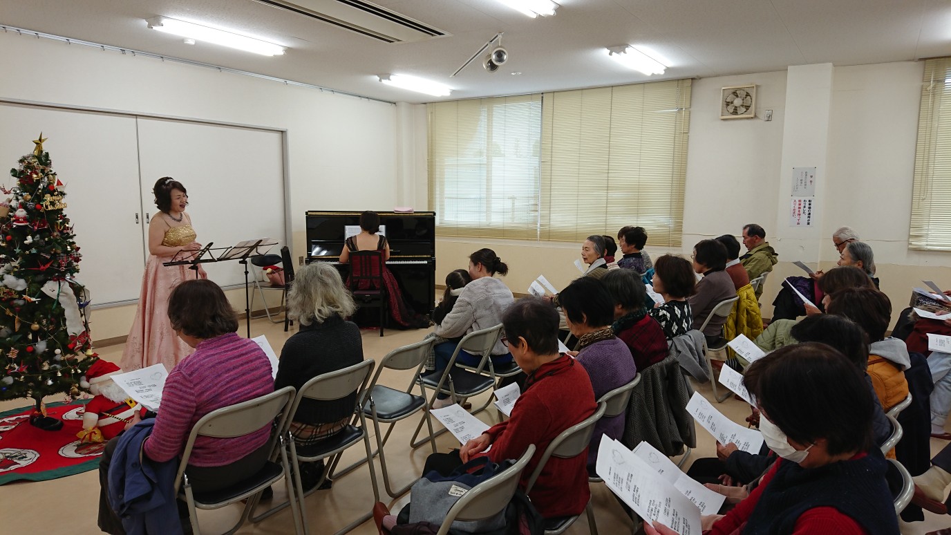 先日、岡山市内にある岡輝公民館でクリスマスコンサートを行いました。 ピアノの松下恵子先生と小松原先生との連弾「ジングルベル」から始まり 小松原先生の歌や鍵盤ハーモニカ、松下先生のピアノソロ、曲当てクイズ等で盛り上がりました。 最後は、中島みゆきさんの「糸」と竹内まりやさんの「いのちの歌」を会場の皆さんと歌い、 クリスマスコンサートを締めくくりました。 12月の気忙しさから少し解放されたような、ホッとする時間を皆さんと一緒に過ごすことが出来て とても嬉しく思っています。